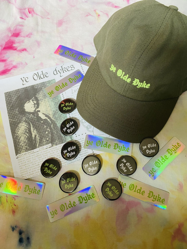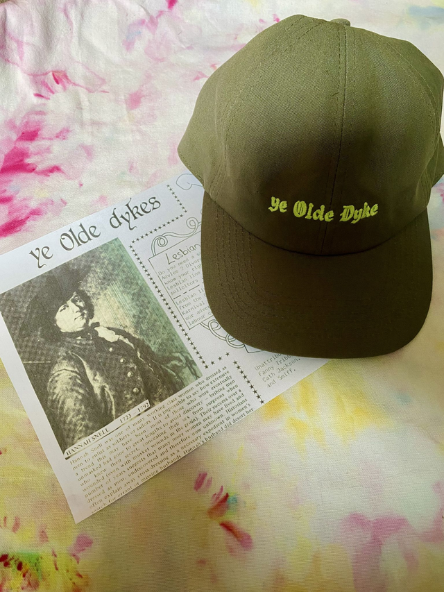 This cap is inspired by 'ye olde dyke', a feature which ran in Diversion magazine, a Nottingham lesbian magazine from the 1980s. Perfect for young dykes looking for a laugh and older dykes ready to embrace their queer elder status. Made to celebrate the launch of THANK YOU FOR CALLING THE LESBIAN LINE - out now!